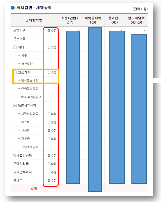 1. 다시 2 단계(step 2. 가기)로 돌아갑니다(연말정산 미리 보기 화면에서 STEP 2로 가기를 클릭하면 됩니다). 아래 노란 네모 칸의 [연금계좌 옆 수정]을 클릭합니다.