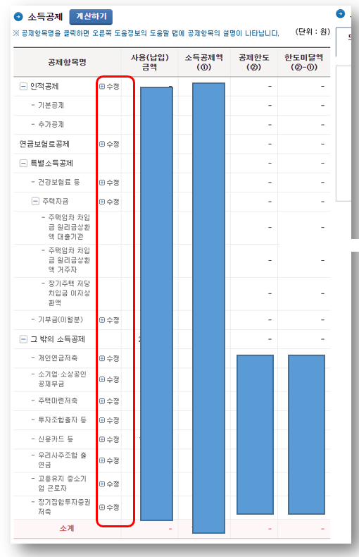 소득공제를 받기 위해 아래의 빨간 선 안의 내용을 수정할 수 있습니다. (+) 표시를 클릭하면 작년의 내용이 보여집니다. 같다면 체크하여 적용하기를 클릭한 뒤, 모든 내역을 수정하였다면 [계산하기]를 클릭하고 [저장] 버튼을 눌러 저장합니다.