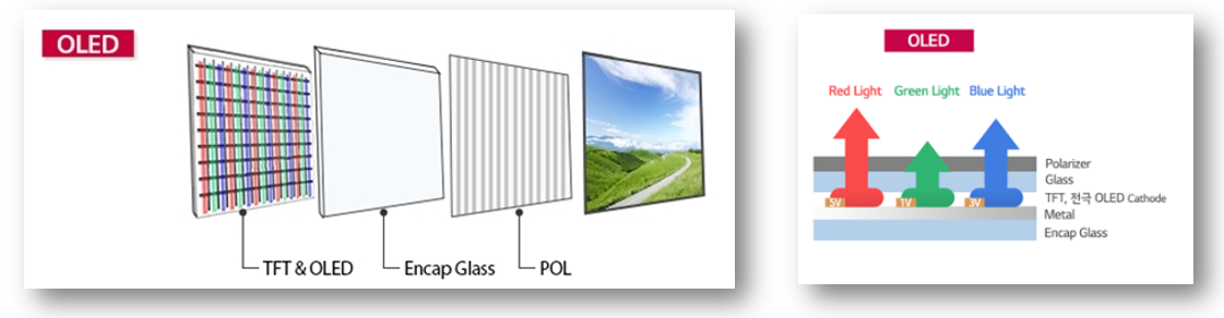 OLED 구성은 LCD에 비해 매우 단순합니다. 그래서 LCD보다 더 가볍고 얇게 만들 수가 있습니다.