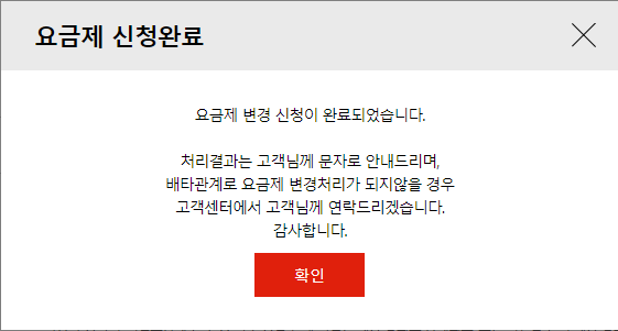 6. 요금제 변경 신청 완료 화면이 뜨면 [확인]을 누릅니다. 요금제 변경신청이 완료되었습니다.