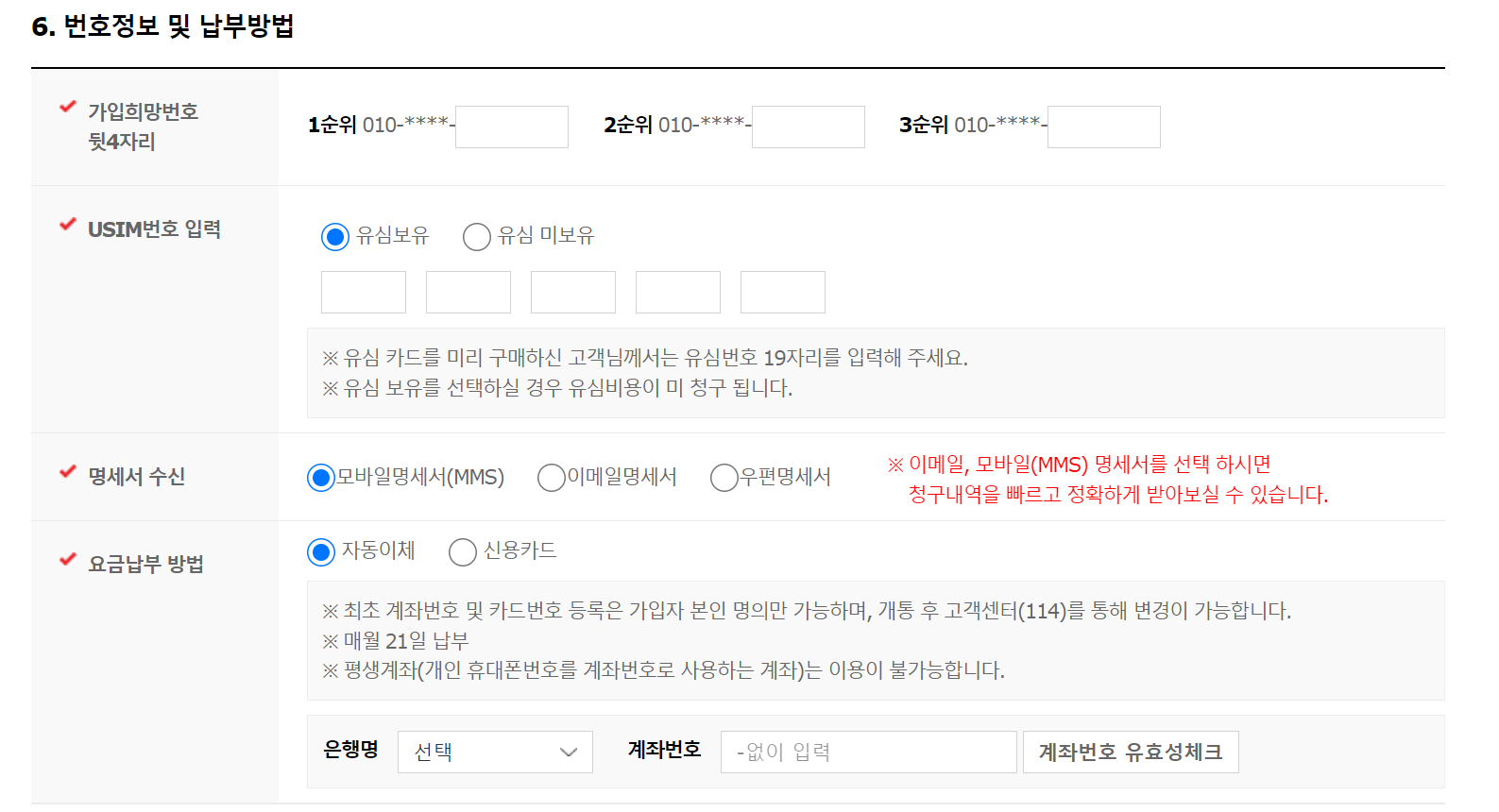 부정 가입방지를 위하여 주민증록증, 운전면허증, 여권 등의 신분증으로 확인하는 단계가 있습니다.