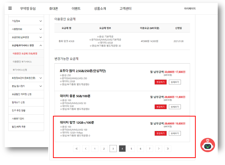 3. 이용중인 요금제 아래로 [변경 가능한 요금제]가 나열됩니다. 제가 가입하려는 [데이터맘썩 12GB+/100분]요금제는 4번째 페이지 맨아래 위치합니다. 저렴한 요금제라서 뒤에 보이나 봅니다.