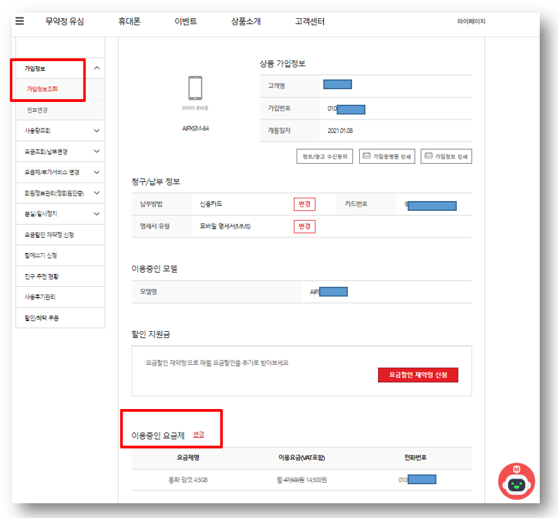 2. 가입정보조회 화면의 중간 부분에 이용중인 요금제 [변경]을 클릭합니다.
