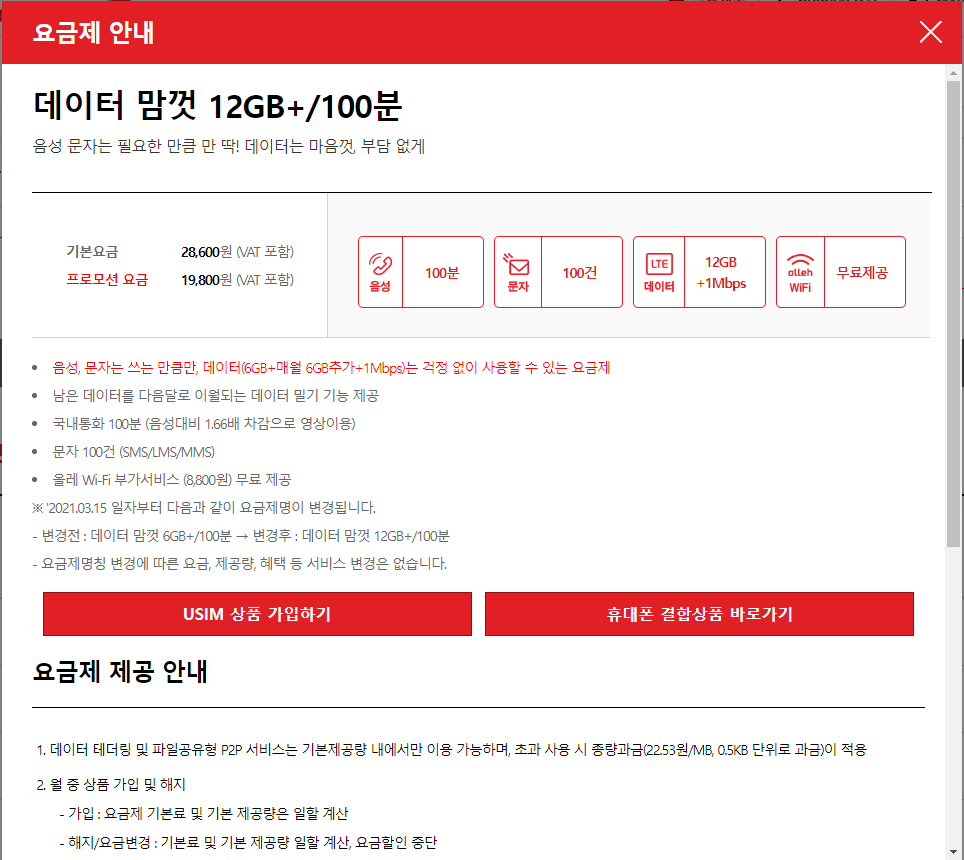 4. 상세보기를 클릭하여 요금제 안내를 살펴봅니다. 기본데이터 제공은 12GB이고, 기본 데이터 소진 시 1Mbps 속도로 계속 데이터를 걱정없이 사용할 수 있는 요금제입니다. 올레 와이파이 부가서비스(8,800원/월) 사용은 무료 제공입니다.