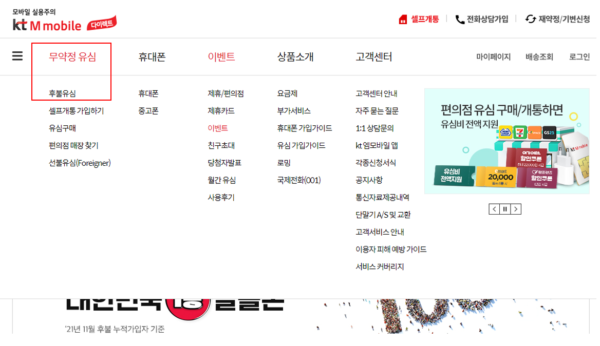 1. kt M모바일 홈페이지 들어가서 로그인을 합니다. [무약정 유심] ---> [후불유심]을 클릭합니다.