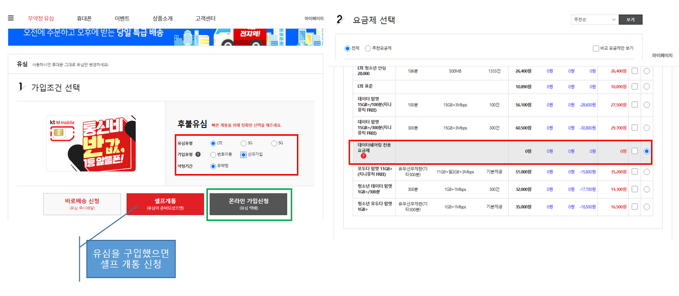 4. 이제 다시 스크롤하여 맨위로 올라와서 [1. 가입조건 선택]에서 [온라인 가입신청]을 선택합니다. 이미 kt M모바일을 사용하면서 추가로 유심을 구입한 경우 [온라인 가입신청]을 클릭하여 진행하여야 합니다. 꼭 명심하세요!!