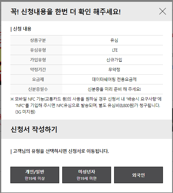 아래 가운데 있는 [셀프개통]은 1인당 1회선만 셀프 개통이 되므로 이미 사용하는 사람이 셀프개통을 진행하면 마지막에 [1회선만 개통 가능합니다]라고 뜨면서 셀프 개통이 진행되지 않습니다.