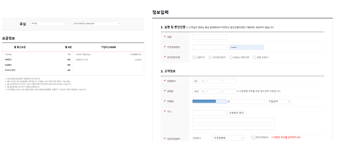 6. 데이터쉐어링 전용요금제 가입신청서가 뜹니다. 실명, 주민등록번호를 입력합니다. 본인인증유형을 선택하여 인증을 진행합니다. 본인 인증 방법은 신용카드, 네이버인증, PASS+계좌인증, 범용인증서 등으로 할 수 있습니다.