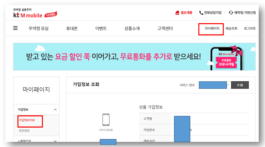 1. kt M모바일 홈페이지에 들어가 로그인을 합니다. 처음 방문자시라면 회원 가입 후 로그인을 합니다. [마이페이지] 선택 - [가입정보조회]를 클릭합니다.