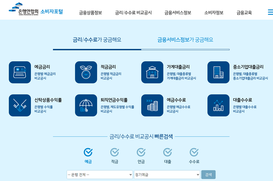 금융상품정보, 금리/수수료 비교공시, 금융서비스정보, 소비자정보, 금융교육