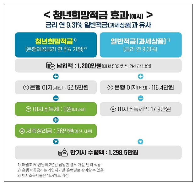 금융당국의 설명에 의하면 청년희망적금은 매월 50만원씩 2년 만기 적금을 납입 후 만기가 되면 이자는 116만 4천 원이지만, 일반 적금은 이자소득세를 과세하므로 17만 9천 원을 공제하고 적금 가입자가 손에 쥐는 금액이 1298만 5000원으로 청년희망적금과 같습니다.