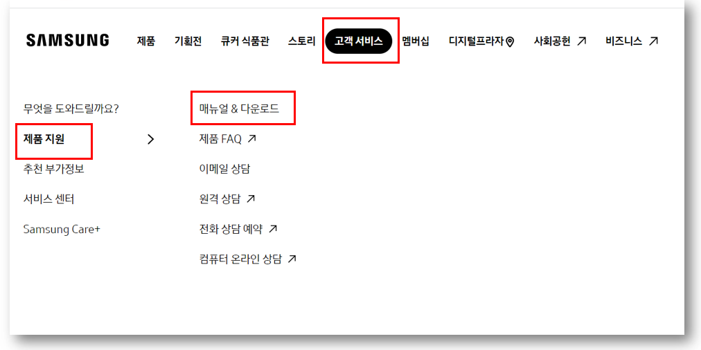 2. 삼성전자 홈페이지에서 [고객 서비스] - [제품 지원] - [매뉴얼 & 다운로드]를 선택합니다. 아래 링크를 따라 들어가셔도 됩니다.