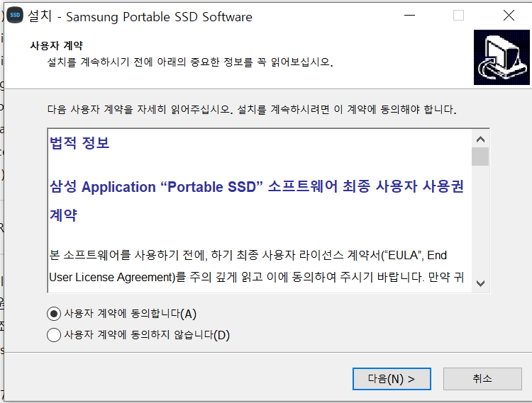5. 설치 화면이 나오면 [사용자 계약에 동의합니다]에 체크 후 [다음]을 클릭합니다.