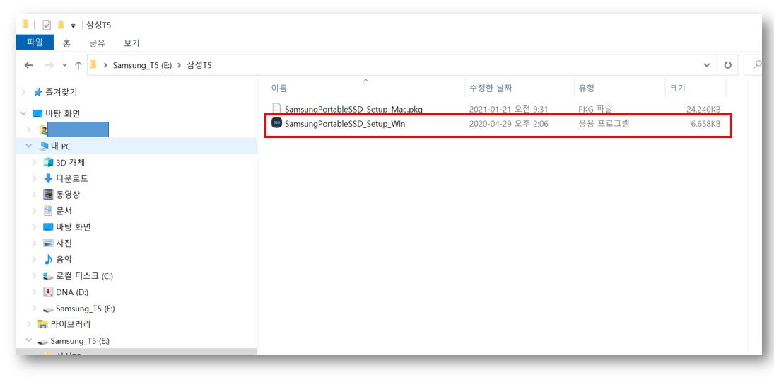 구매한 삼성 SSD T5를 PC에 연결하여 내 컴퓨터에서 Samsung T5를 선택하면 아래 그림과 같이 셋업을 위한 응응 프로그램이 보입니다. 더블클릭하면 아래 소프트웨어 설치하기와 같이 프로그램을 설치할 수 있습니다.