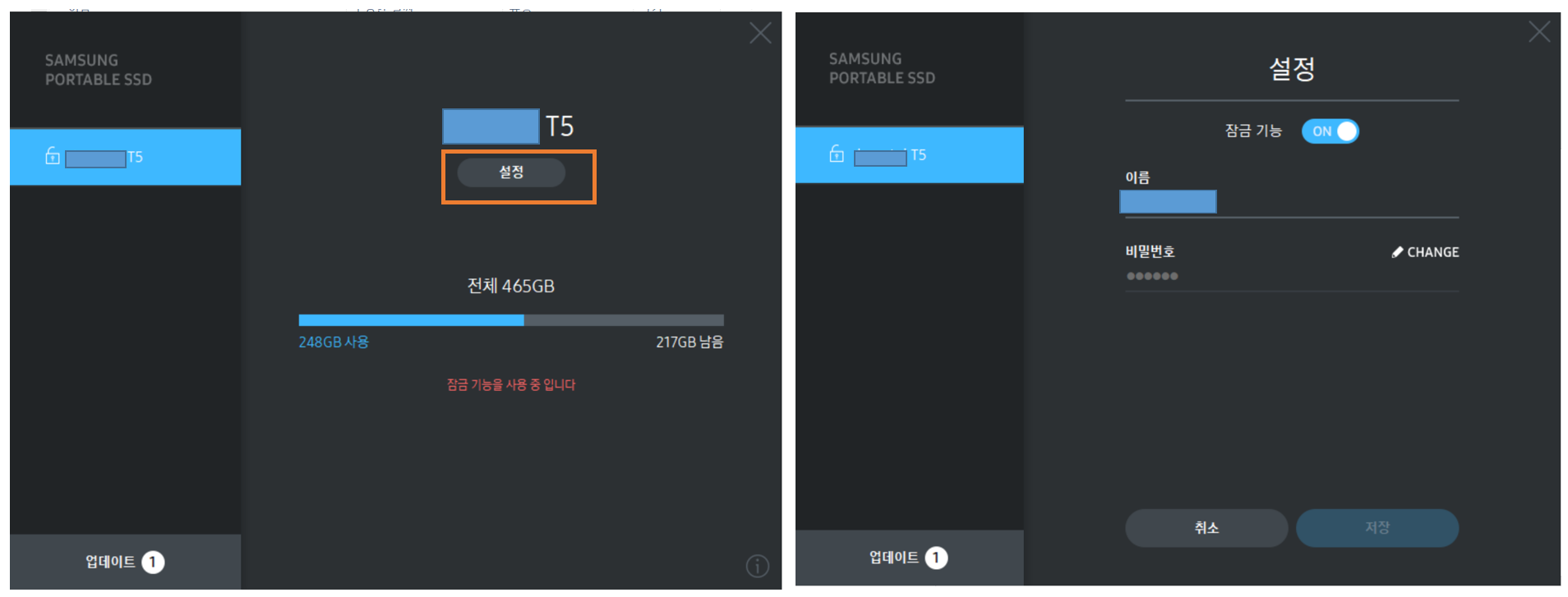 외장하드 이름(처음에는 Samsusng T5로 되어 있었던 것 같아요) 아래 [설정]을 클릭해서 외장하드 이름과 비밀번호를 변경하거나 설정할 수 있습니다.