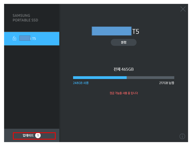 내 컴퓨터에 들어가면 Samsung T5가 폴더가 있습니다. 아래 그림처럼 업데이트할 내용이 있으면 숫자로 보입니다. 클릭해서 업데이트를 진행하고 사용 하면 됩니다.