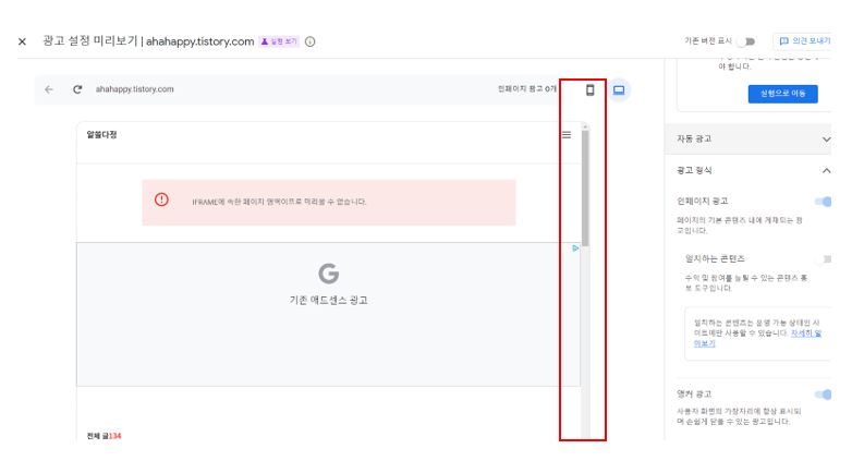아래와 같이 광고 설정 미리보기 화면으로 진행하고 광고를 게재하기 적합한 위치를 찾습니다. 처음에 할 때는 시간이 오래 걸립니다. 그래서 저는 그냥 로그아웃하고 며칠 있다가 들어왔더니 광고 미리보기가 금방 되더라고요.