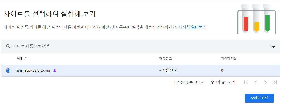 실험을 진행할 사이트를 선택합니다. 저는 사이트가 하나라서 하나만 선택했습니다. 사이트가 여러 개라면 원하는 사이트를 선택해서 진행하면 되겠죠?