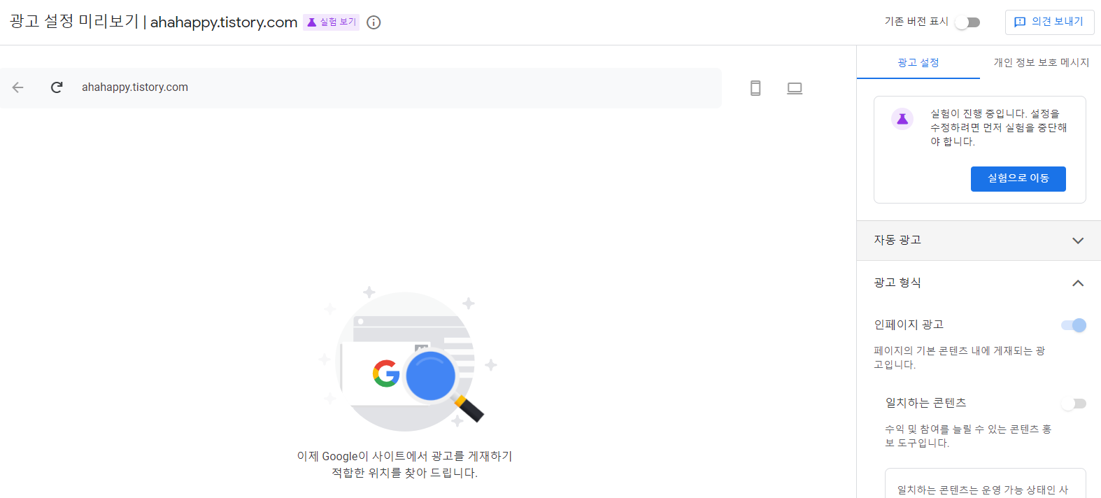 아래와 같이 광고 설정 미리보기 화면으로 진행하고 광고를 게재하기 적합한 위치를 찾습니다. 처음에 할 때는 시간이 오래 걸립니다. 그래서 저는 그냥 로그아웃하고 며칠 있다가 들어왔더니 광고 미리보기가 금방 되더라고요.