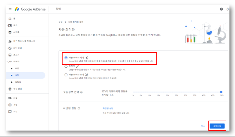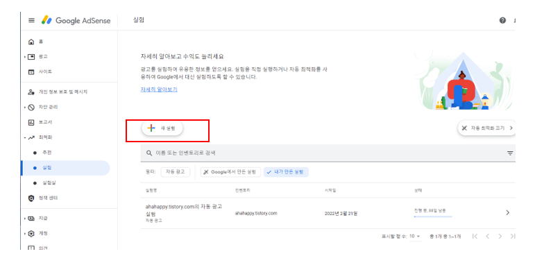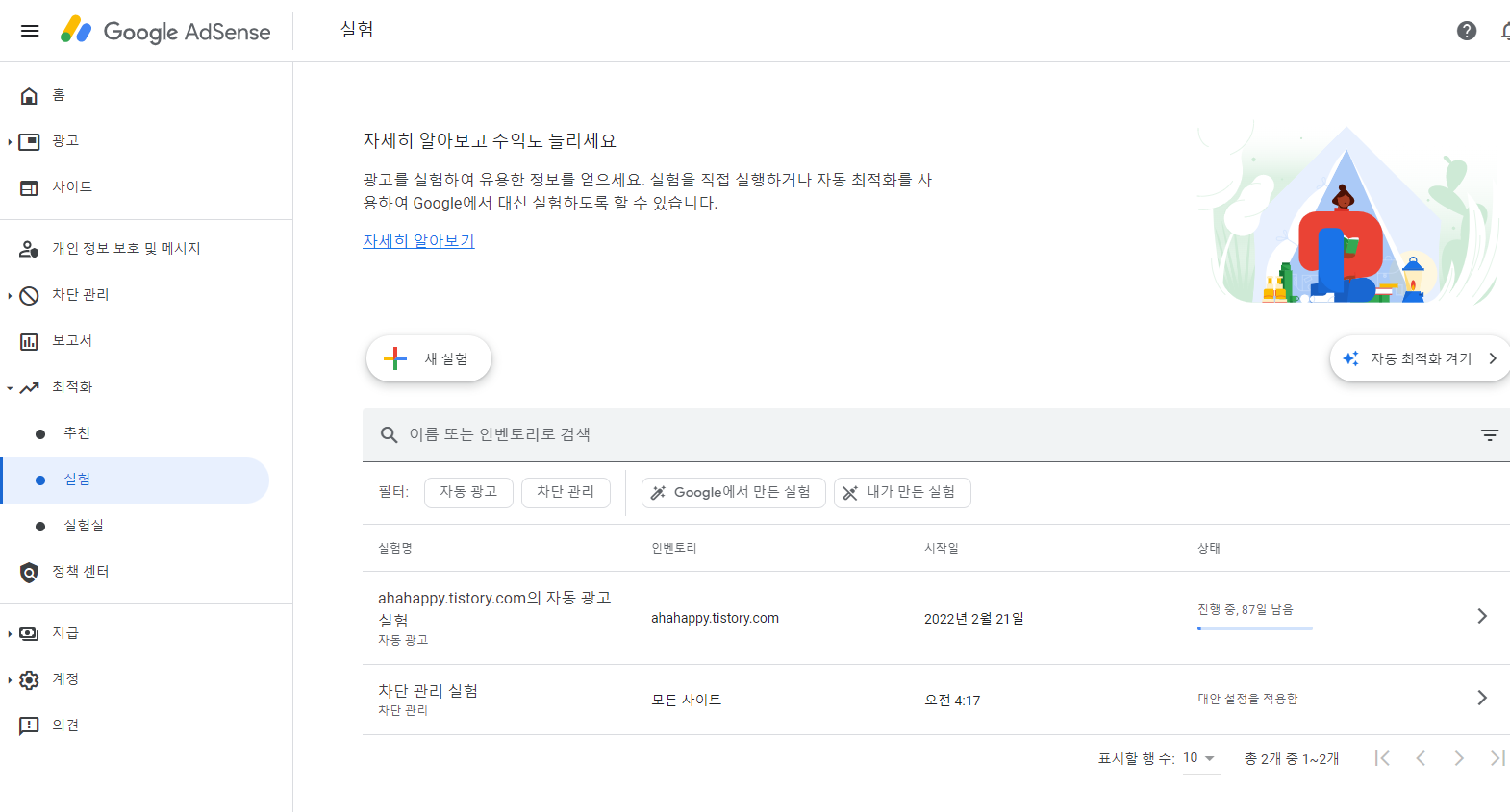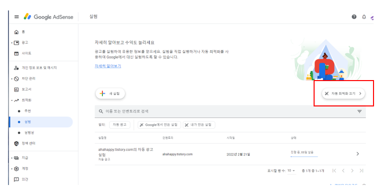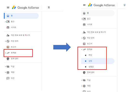 구글 애드센스 홈에서 아래 그림처럼 '최적화'를 클릭하면 추천, 실험, 실험실 항목이 나옵니다. 실험을 선택합니다.