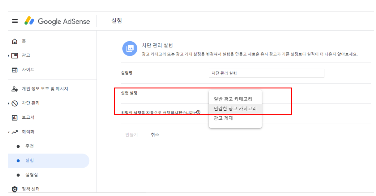 실험 설정에서 [민감한 광고 카테고리]를 선택합니다.