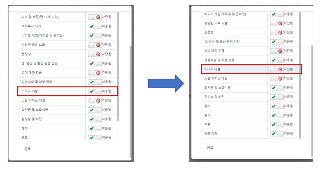 차단하고자 하는 카테고리를 커서로 클릭하여 [차단함]으로 바꾸어 줍니다. 저는 이전에도 차단한 항목이 많아서 여러 개 차단함으로 되어 있습니다. 처음에는 모두 허용으로 되어 있습니다. 차단하고자 하는 카테고리를 차단함으로 설정합니다. 저는 소비자 대출을 [허용함]에서 [차단함]으로 변경했습니다. 모두 설정했으며 우측 스크롤을 맨 아래로 내리면 [완료] 버튼이 있습니다. 꼭 완료 버튼을 눌러줘야 합니다.