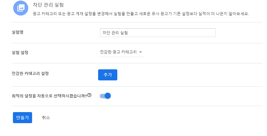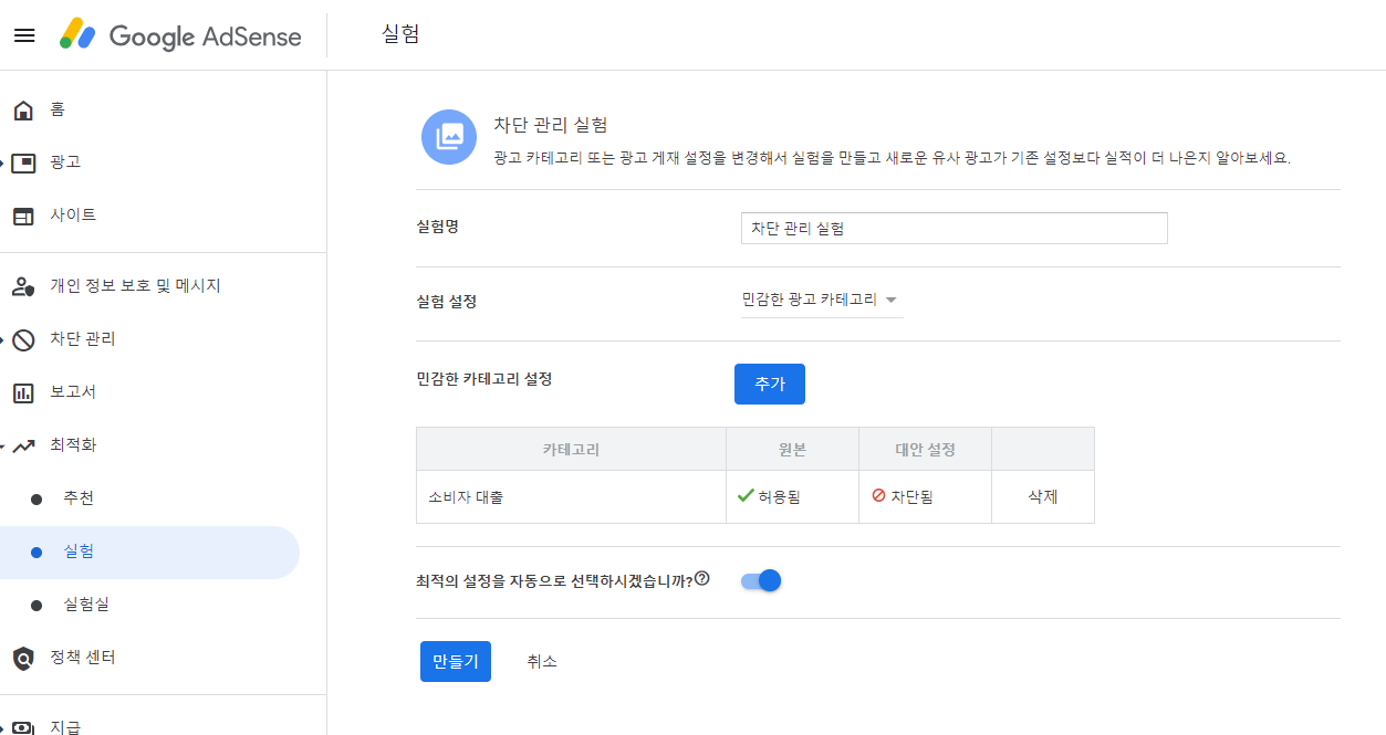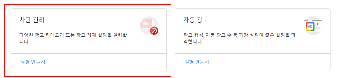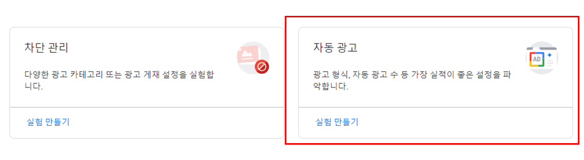 [차단 관리] 실험과 [자동 광고] 실험이 있습니다. 원하는 것을 선택하여 실험을 하면 됩니다. 우리는 [자동 광고] 실험을 통해 수익을 최대화할 수 있는 광고 위치를 실험하는 것이니 우측의 [자동 광고]를 선택하여 [실험 만들기]를 클릭합니다.