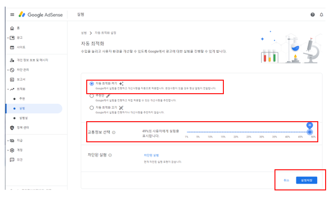 구글 애드센스의 실험실 화면으로 자동 넘어갑니다. 자동 최적화 사용 설정을 하지 않은 경우에는 자동최적화 끄기에 체크되어 있습니다. 광고 게재 위치 자동 최적화를 하려면 아래 그림처럼 '자동 최적화 켜기'를 체크하면 됩니다.