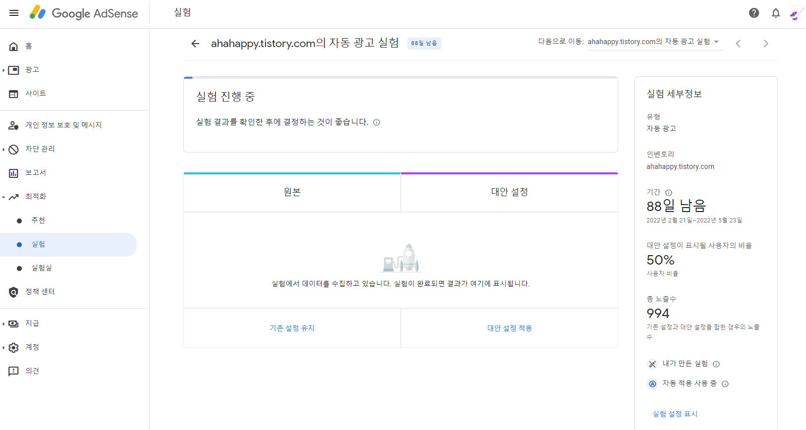 자동 광고 실험 내용이 나옵니다. 저는 2월 21일 신청해서 88일 남은 것으로 나오는군요. 실험기간은 사이트별 트래픽을 기준으로 설정하는 것이라서 사이트 별로 다른 것 같습니다. 88일 뒤 실험이 끝나면 지금 현재 내가 광고를 게재하는 위치와 실험에서 나온 위치의 효과를 확인하여 알려주겠죠? 그럼 수익이 높은 쪽으로 적용을 하면 된다고 합니다. 자동 최적화 기능을 한다고 그냥 적용되는 것이 아닌 것 같습니다.