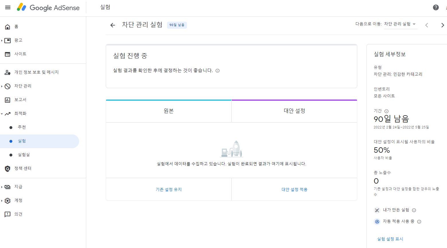 홈에서 [실험]을 클릭해보면 아래 그림처럼 차단 관리 실험을 하고 있음을 확인할 수 있습니다.