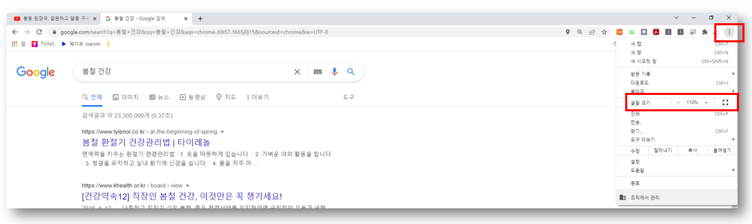 우측 빨간 동그라미에서 보듯이 확대는 키보드에서 [Ctrl] + [+], 축소는 Ctrl] + [-] 키보드를 활용하면 됩니다. 즉 컨트롤 키보드를 누른 상태에서 +, - 키보드를 누르면 확대되거나 축소됩니다.