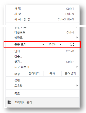 메뉴 중간 부분에 [글꼴 크기]를 설정할 수 있습니다. 기본적을 100%가 인터넷 기본 배율입니다. 크게 하고 싶으면 100% 이상으로, 축소하고 싶으면 100% 이하로 설정하면 됩니다. 숫자 옆의 +, - 기호를 클릭하여 조정합니다.