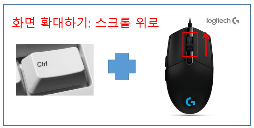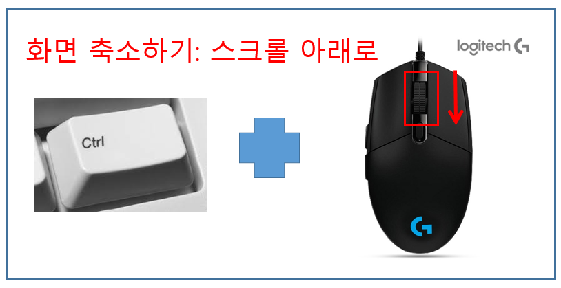 우선 가장 쉬운 방법은 [Ctrl + 마우스 스크롤] 을 사용합니다. 컨트롤 키를 누른 사태에서 마우스 휠을 위로 올릴 때마다 비율이 확대되고, 아래로 내릴 때마다 축소됩니다.