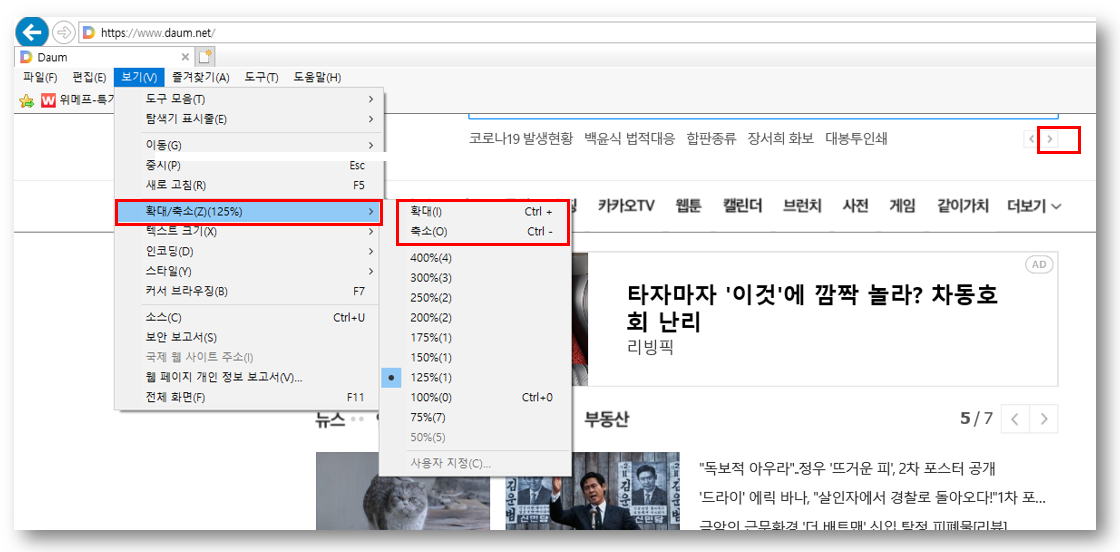 인터넷 익스플로러에서는 아래 그림처럼 메뉴바에서 [보기]를 선택하고 중간의 [확대/축소]를 선택합니다. 비율 보기에서 원하는 사이즈를 선택하면 됩니다. 100% 보다 크게 설정하면 화면이 확대되고, 100%보다 작게 설정하면 인터넷 화면이 작아집니다