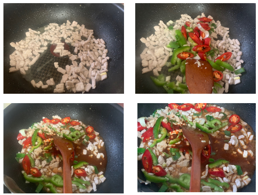 10. 다음은 프라이팬에 다시 기름을 적당히 두르고 다진 돼지고기를 넣고 잘 볶아줍니다. 고기가 완전히 익고 나면 피망, 홍고추를 넣고 살짝 볶고 난 뒤, 양념장을 한 번에 투하하여 잘 섞어줍니다.