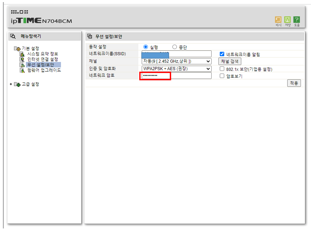 5. 아래 그림처럼 나의 네트워크 이름이 나오고 네트워크 암호는 점으로 표시되어 보호되고 있습니다.