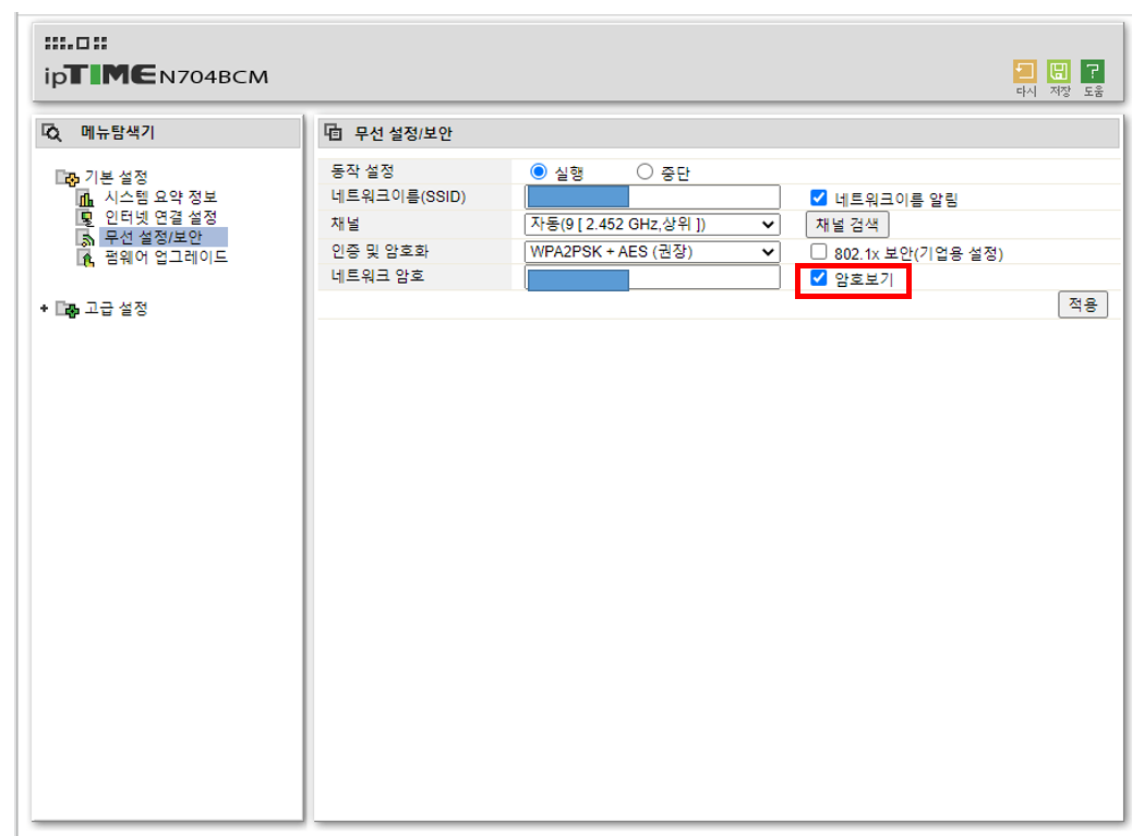 6. 암호를 확인하려면 [네트워크 암호] 옆의 [암호보기]를 체크합니다. 그럼 앞서 점으로 보호되고 있던 네트워크 암호를 확인할 수 있습니다.