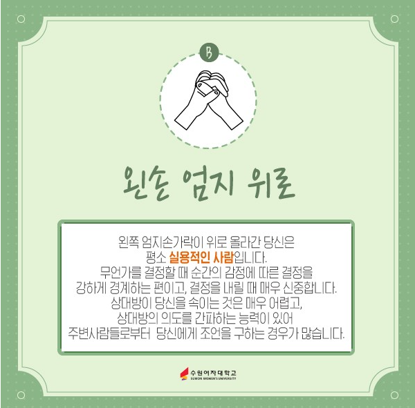 손깍지를 꼈을 때 왼손의 엄지가 오른손의 엄지손가락 위로 올라와 있다면 당신은 매우 [실용적인 사람] 일 수 있습니다. 다른 사람들의 장단점을 잘 파악하는 눈썰미를 가져 상대방의 의도를 간파하는 능력이 있어 주변 사람들이 당신에게 조언을 구하는 경우가 많습니다. 또한 매사에 신중하여 어떤 결정을 내릴 때 성급함이 전혀 없습니다.