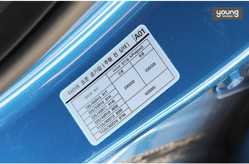 모든 타이어에는 그것에 알맞은 공기압이 있습니다. 순정 타이어는 운전석 쪽 물을 열면 보이는 스티커 표에서 수치를 확인할 수 있습니다. 단, 일교차가 심해 공기의 팽창과 수축이 자주 일어나는 여름철에는 공기압을 평소보다 높게 유지하고, 반대로 겨울철에는 공기압을 낮게 유지하여 마찰 면적을 높여야 합니다.