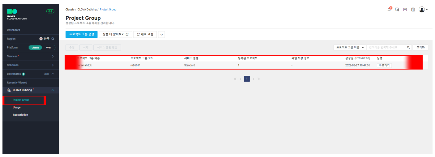 4. Project Group을 클릭하면 아래 그림처럼 우측에 내가 이용하는 서비스 내용이 나옵니다.