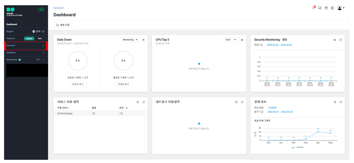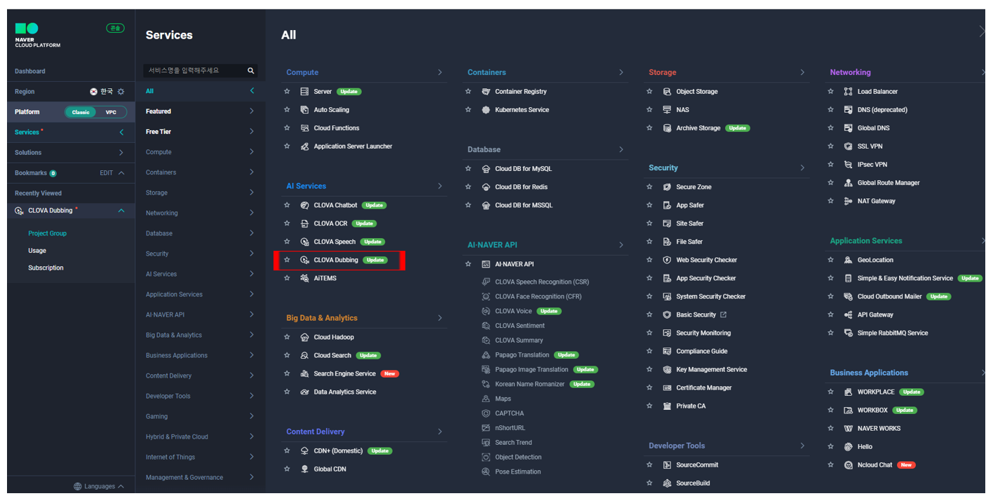 3. 다양한 서비스가 엄~~첨 많이 나옵니다. 잘 찾아보면 CLOVA Dubbing이 보입니다(빨간 박스)