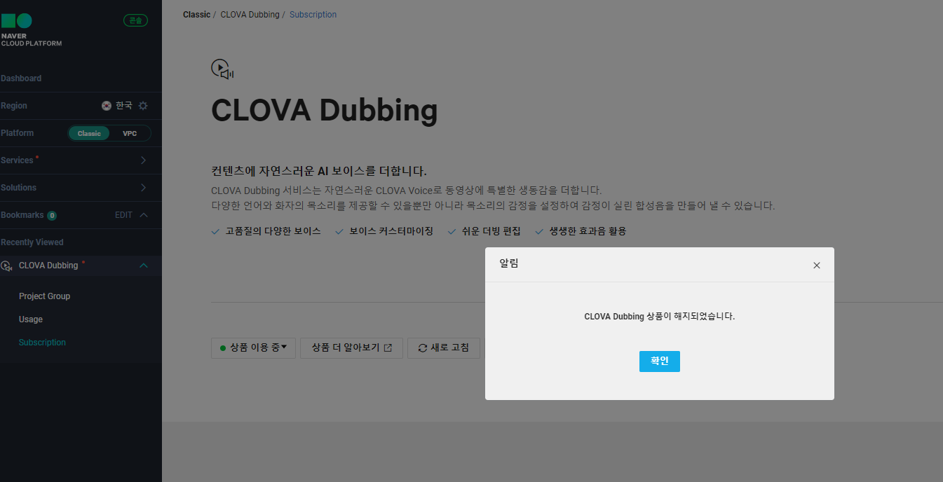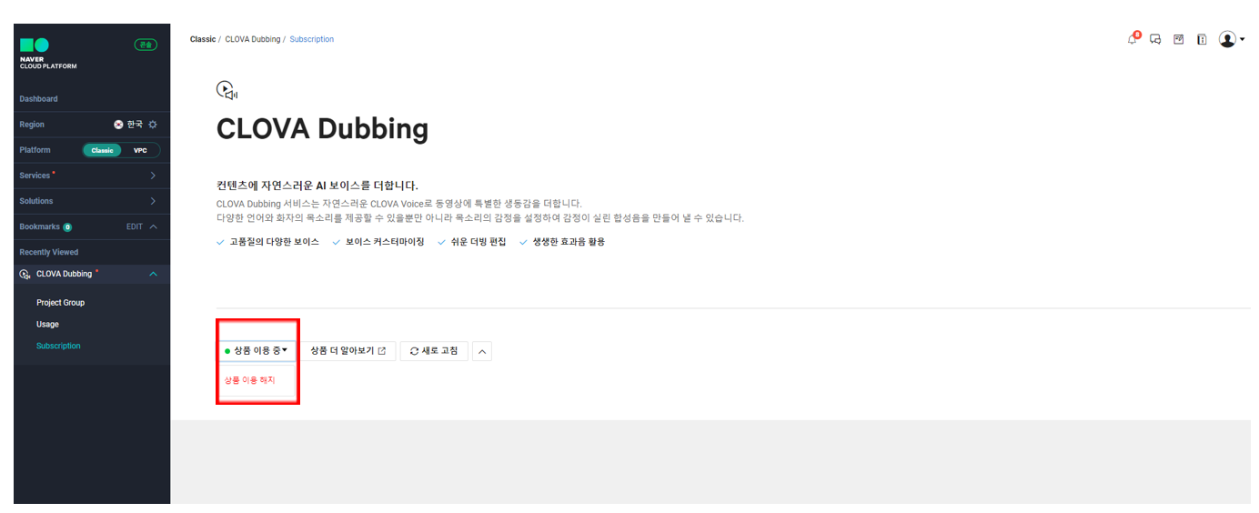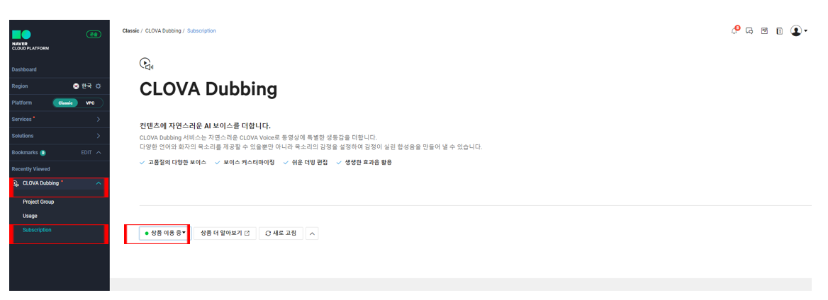 8. 콘솔에서 Clova Dubbing을 선택한 후 맨 아래 (Subscription]을 클릭하면 아래 그림처럼 우측 화면이 바뀝니다. [상품 이용 중]을 클릭합니다.