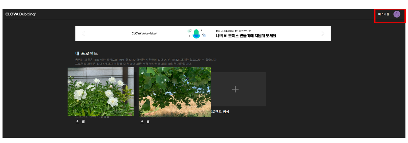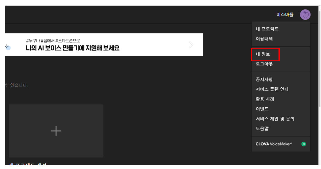 1. 네이버클로바에 더빙에 로그인합니다. 맨 우측 나의 정보에 해당하는 부분을 클릭합니다