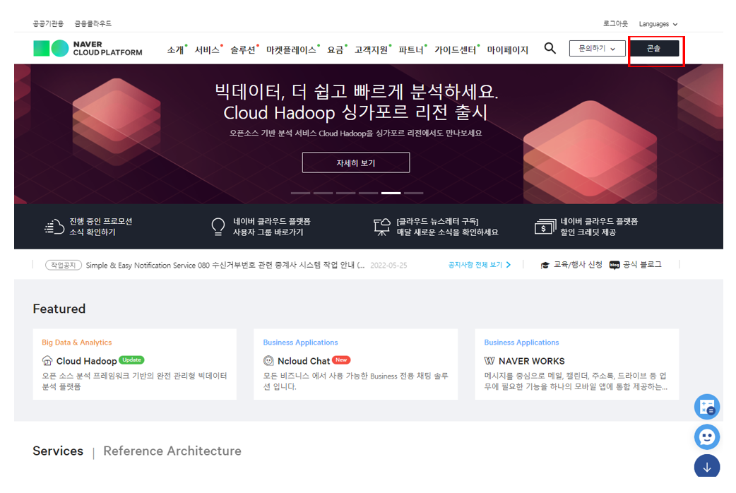1. 네이버 클라우드 플랫폼에 로그인합니다. 우측 상단의 [콘솔]을 클릭합니다.