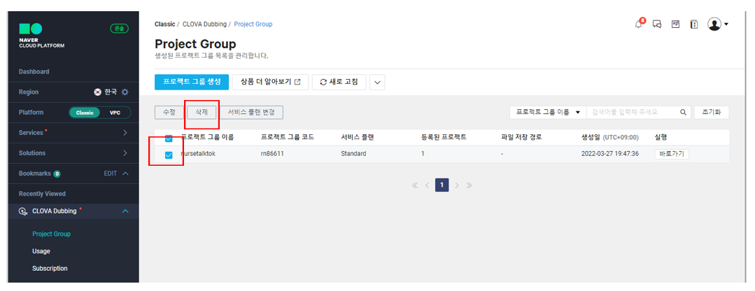 5. 내 프로젝트 그룹을 선택한 후 [삭제]를 클릭합니다.