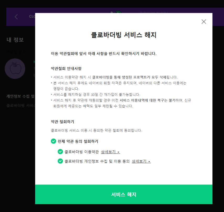 4. 전체약관 동의 철회하기를 클릭하고 [서비스 해지]를 클릭합니다.