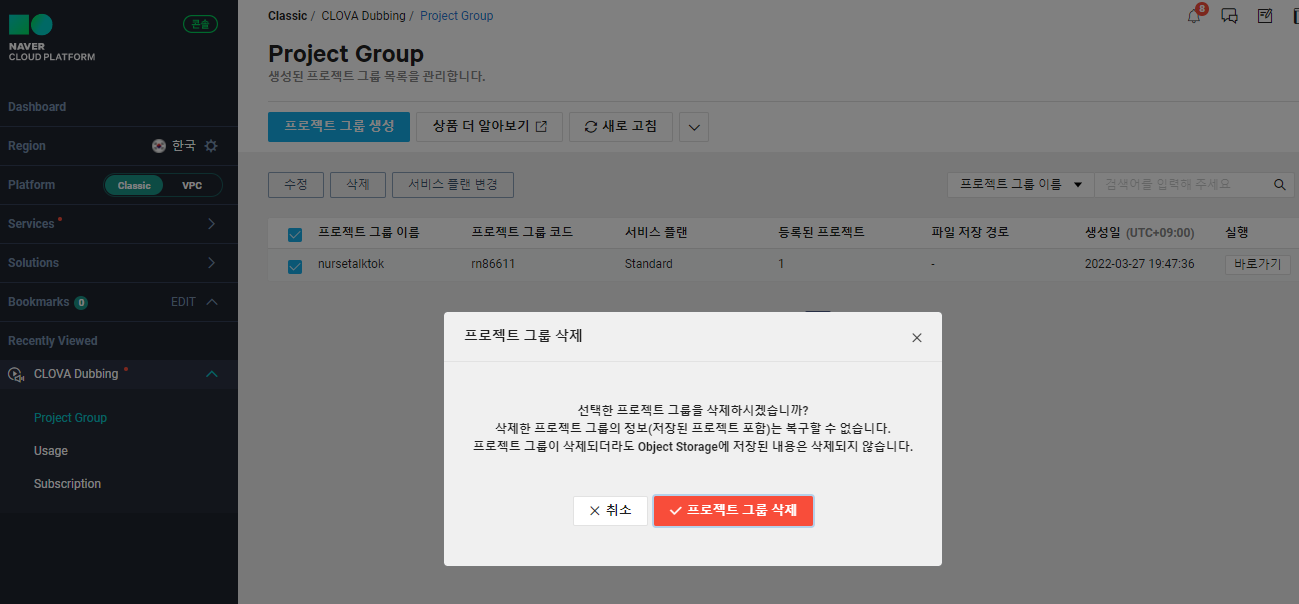 6. 아래 그림처럼 나오면 [프로젝트 그룹 삭제]를 클릭합니다.