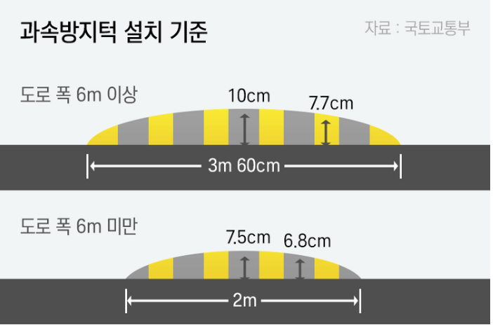 도로에는 주행 중 과속을 방지하기 위한 과속방지턱이 많이 있습니다. 과속방지턱은 차량의 주행 속도를 강제로 낮추기 위한 ‘도로안전시설’입니다, 국토교통부가 정한 규격으로 도로 곳곳에 설치되어 있어서 운전을 하는 사람들이라면 하루에도 심심찮게 마주하게 됩니다.