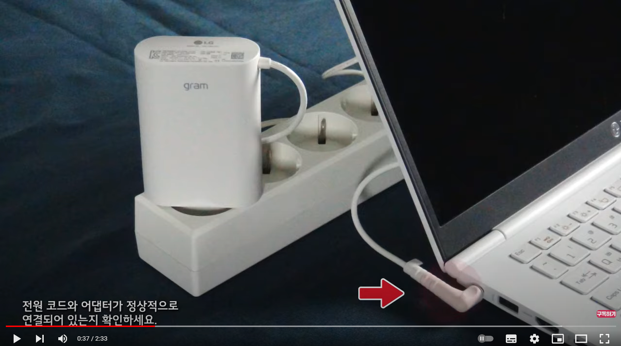 우선 전원이 켜지지 않을 경우, 가장 먼저 해야 할 일은 전원 코드와 어댑터가 정상적으로 연결되어 있는지 확인하는 것입니다. 혹시 모르니 전원코드와 어댑터를 분리하였다가 다시 꽂아보기를 추천합니다.