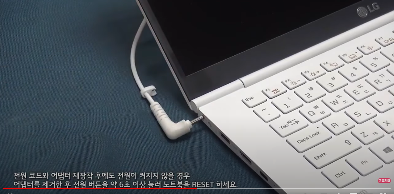 이런 경우에도 어댑터를 제거한 후 전원 버튼을 6초 이상 눌러 노트북을 리셋해줍니다. 리셋 후 자동으로 전원이 켜지지만 그렇지 않은 경우에는 전원버튼을 한 번 더 눌러 켜 주시기 바랍니다.